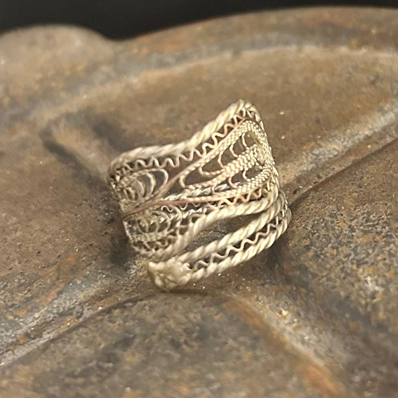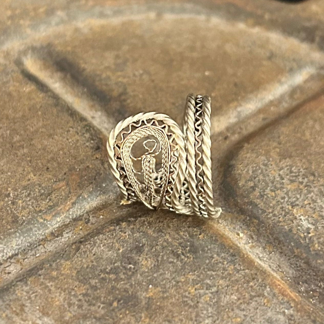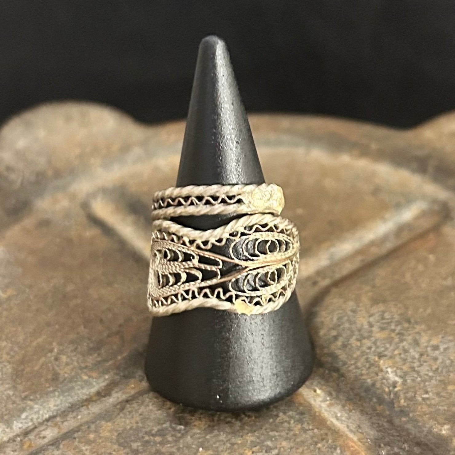 This extraordinary ring has been created from an antique Turkish Ottoman silver filigree spoon handle, dating back to the Kuros design era (1909–1918).