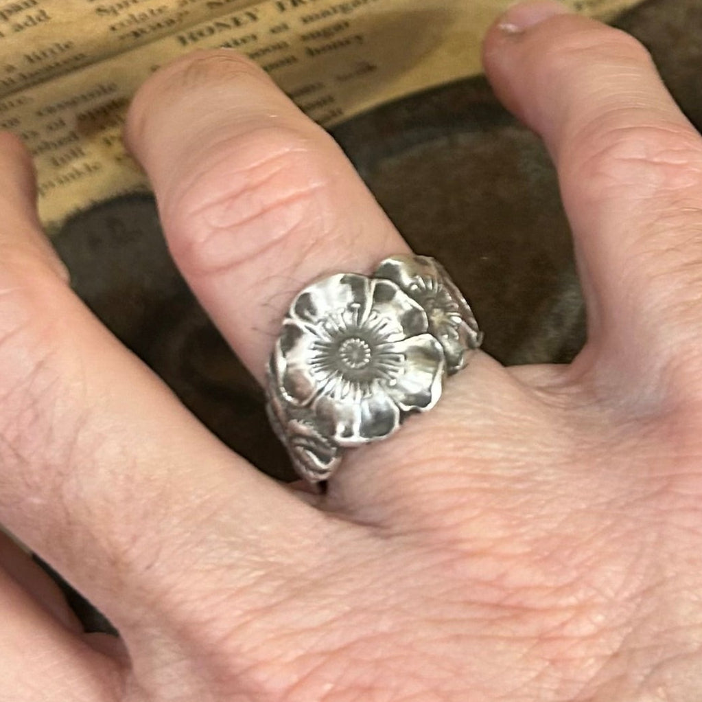 Shaped into a comfortable band, the spoon end has been carefully hand tapered and tucked beneath the final petal, creating a seamless finish. Romantic, feminine, and full of soul this is a piece to wear, love, and eventually pass on.