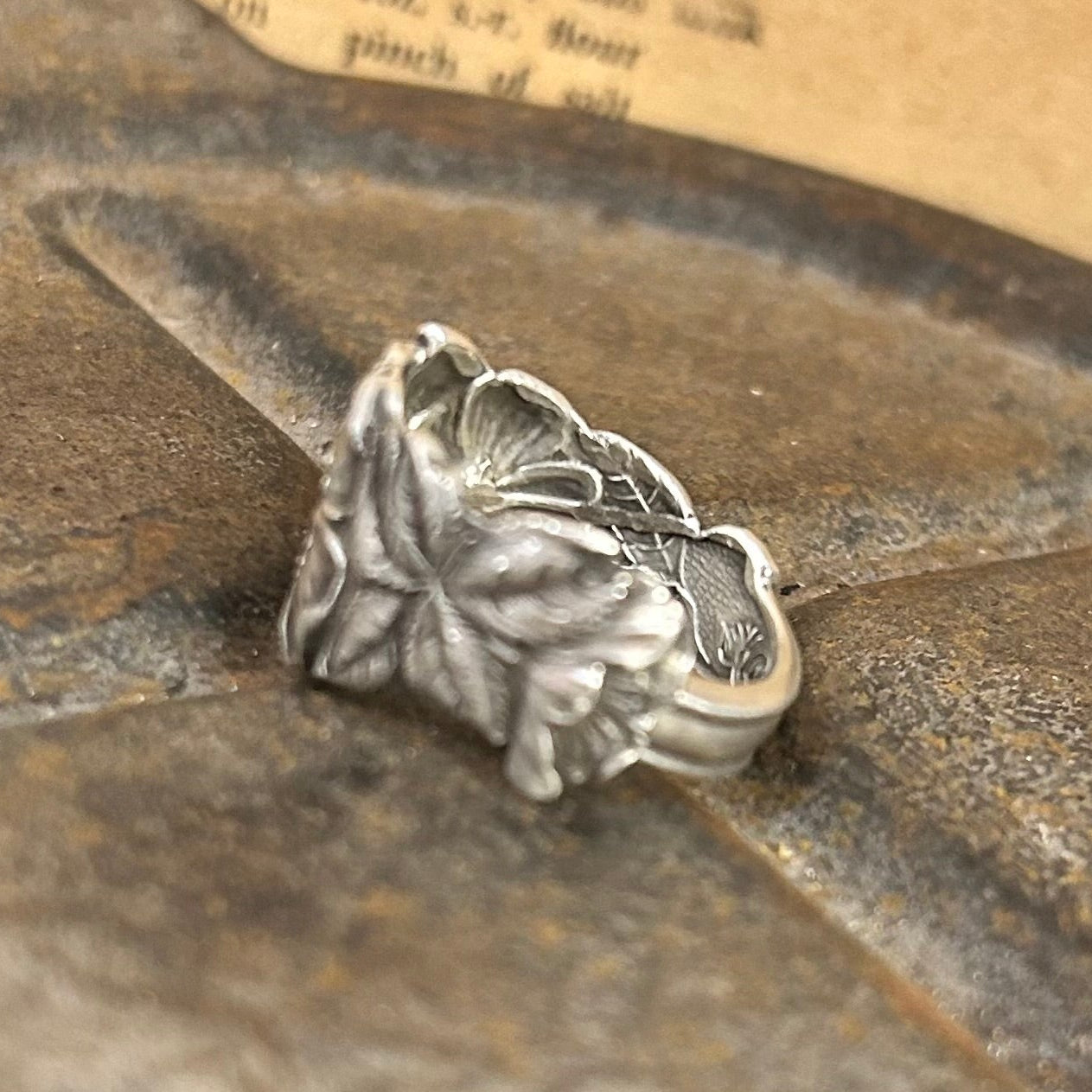 This beautiful ring has been created from an antique sterling silver spoon handle dating back to the late 1800s, a time when everyday objects were made with true artistry and care.
