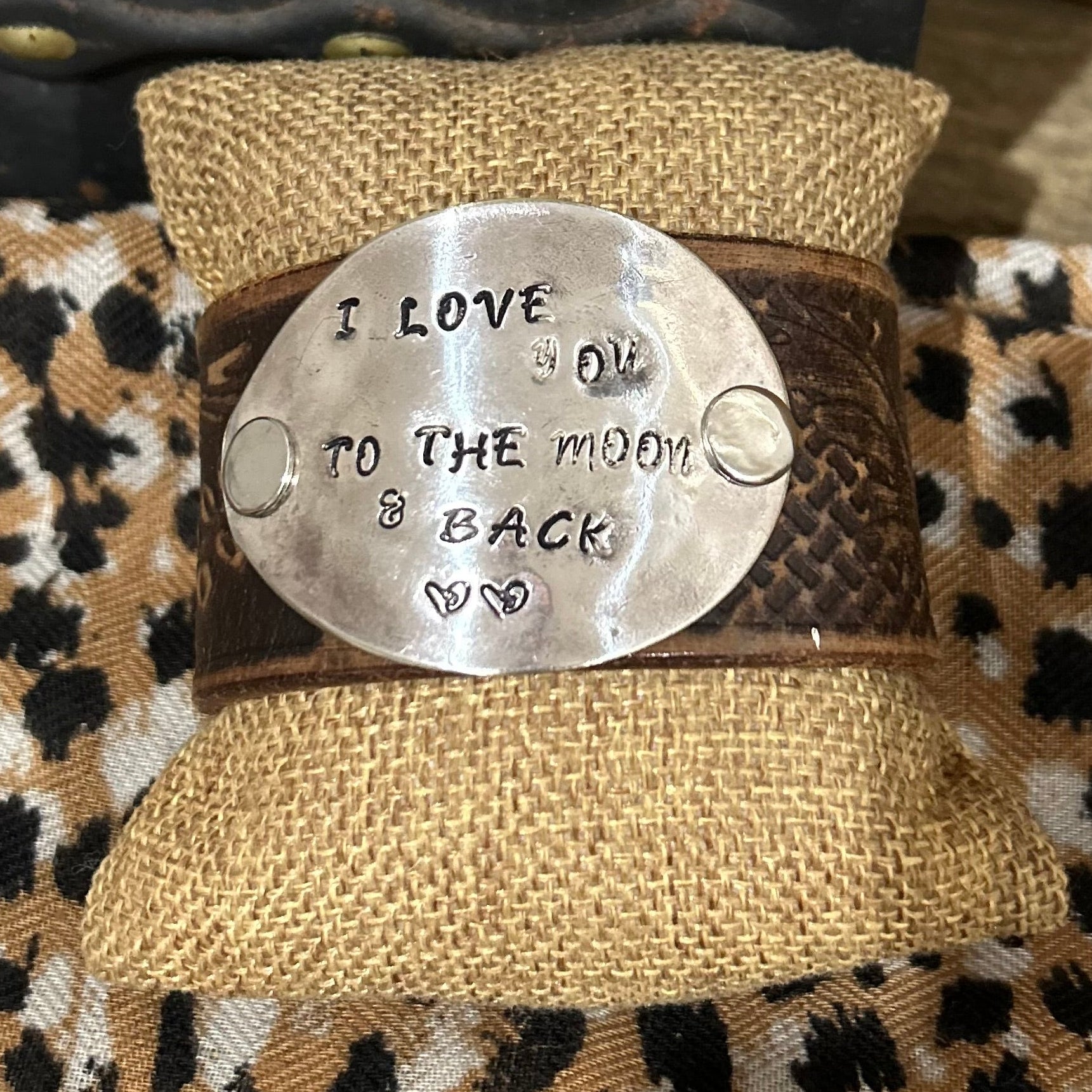 Created from a beautifully textured brown leather belt and a vintage spoon bowl this heartfelt cuff is a reminder of deep love that never ends.