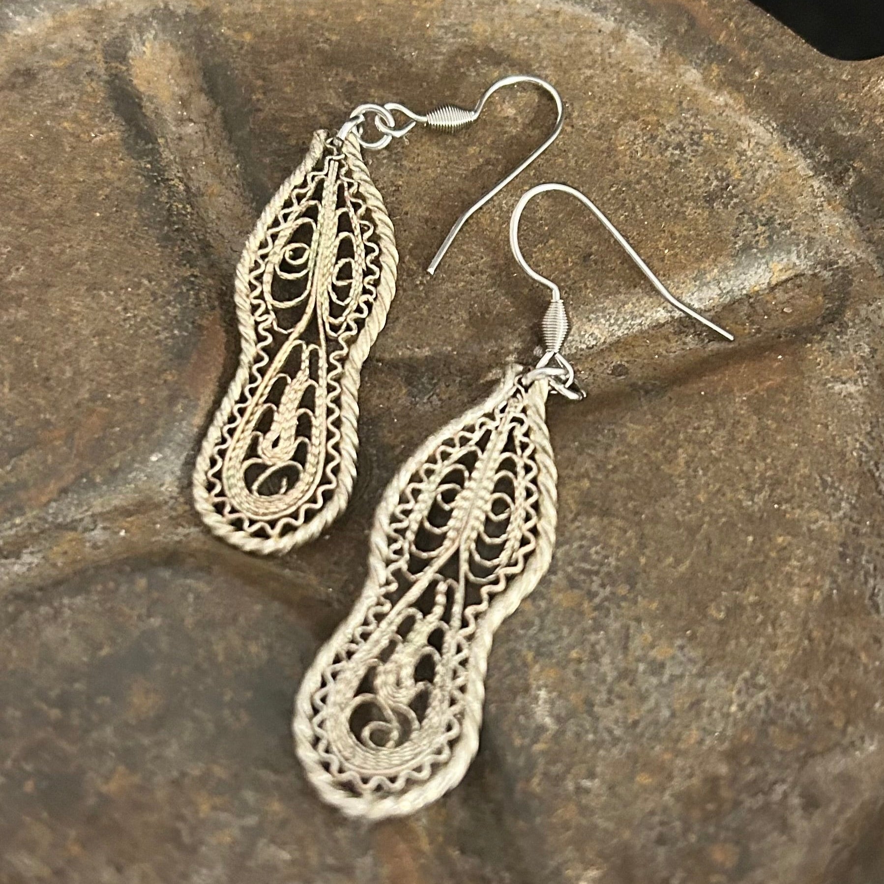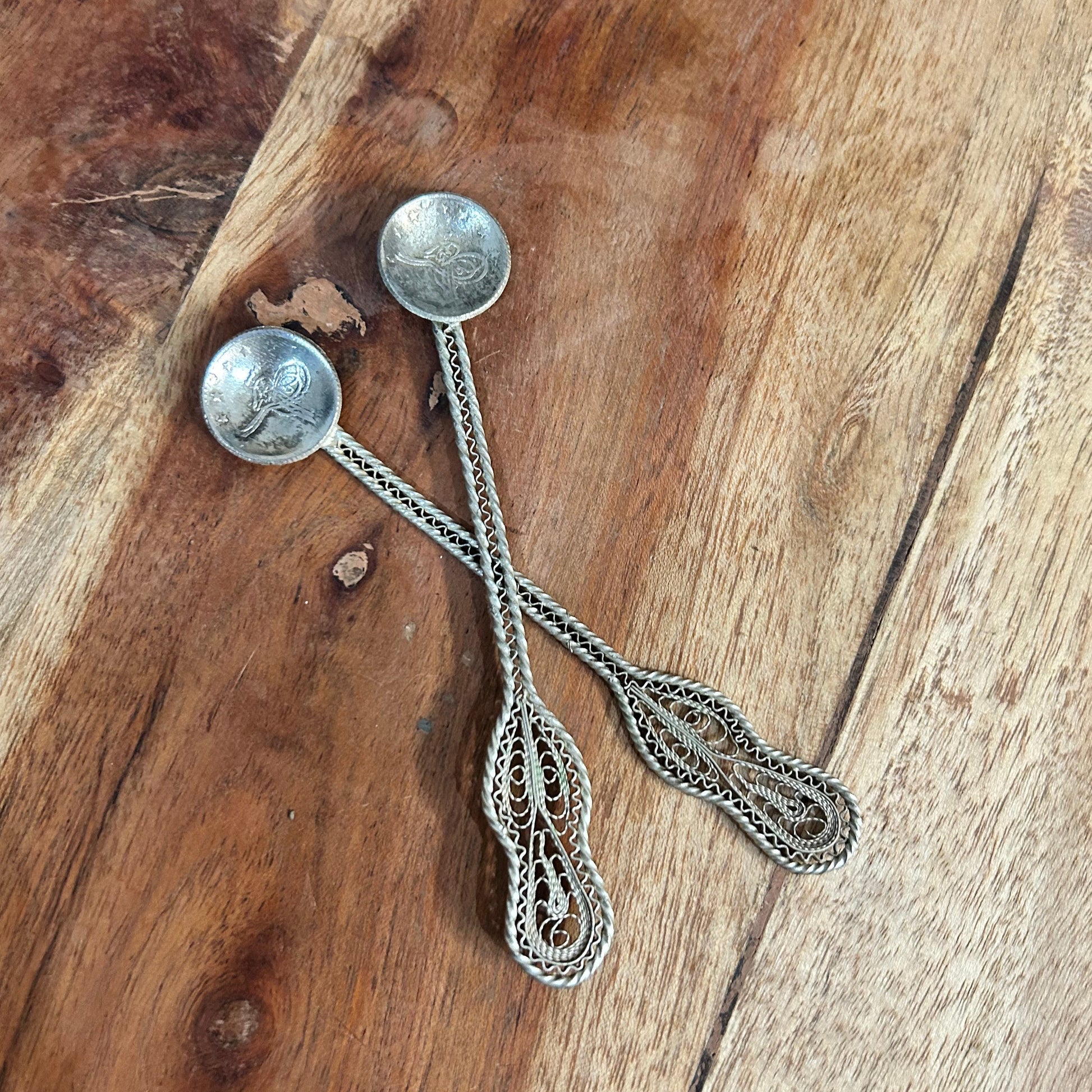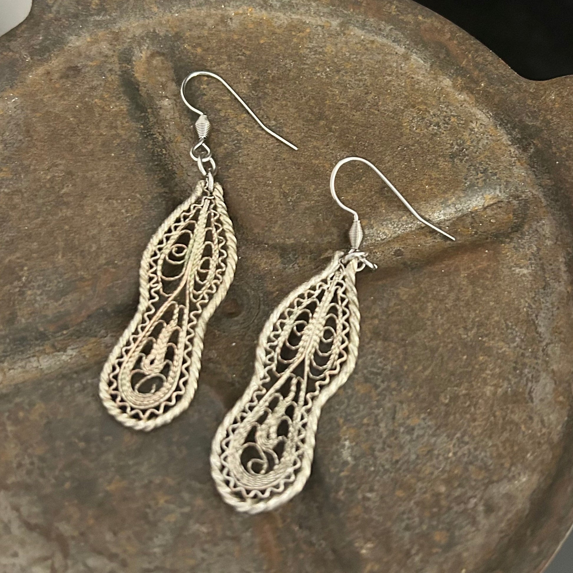 These exquisite earrings are hand crated from antique Turkish Ottoman silver, featuring intricate filigree work.