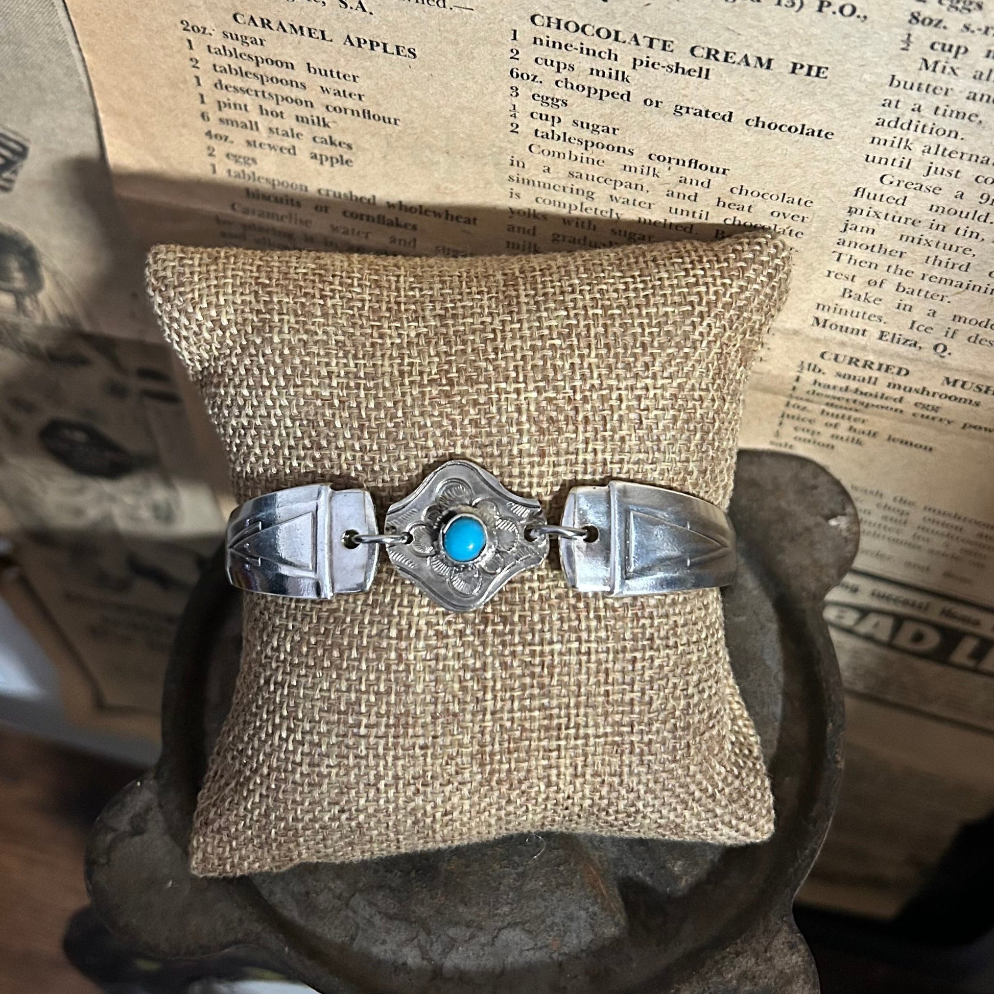 This one-of-a-kind bracelet is handcrafted from vintage silverware handles stamped Duchess, chosen for their understated beauty that lets the centerpiece truly shine.