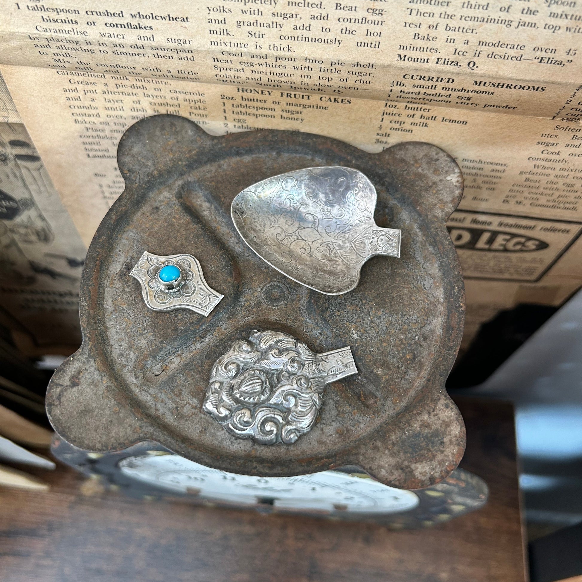 Connector piece crafted from antique Tibetan medicine spoon - Understated silverware handles allow the intricate Tibetan centerpiece to take focus