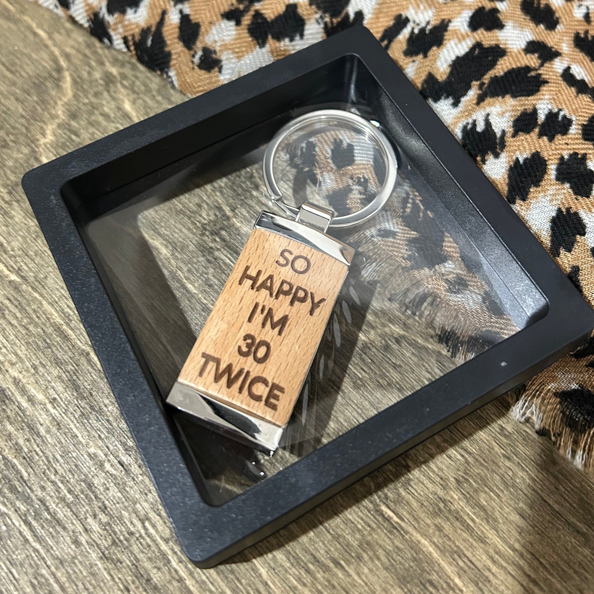Celebrate the big 30 with something a little cheeky and meaningful. This unique key tag blends natural timber on the front with a silver toned metal body, laser engraved with so happy I’m 30.