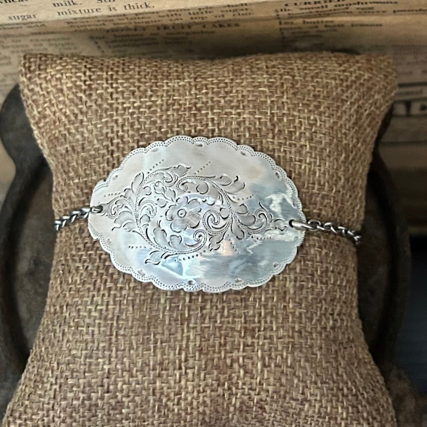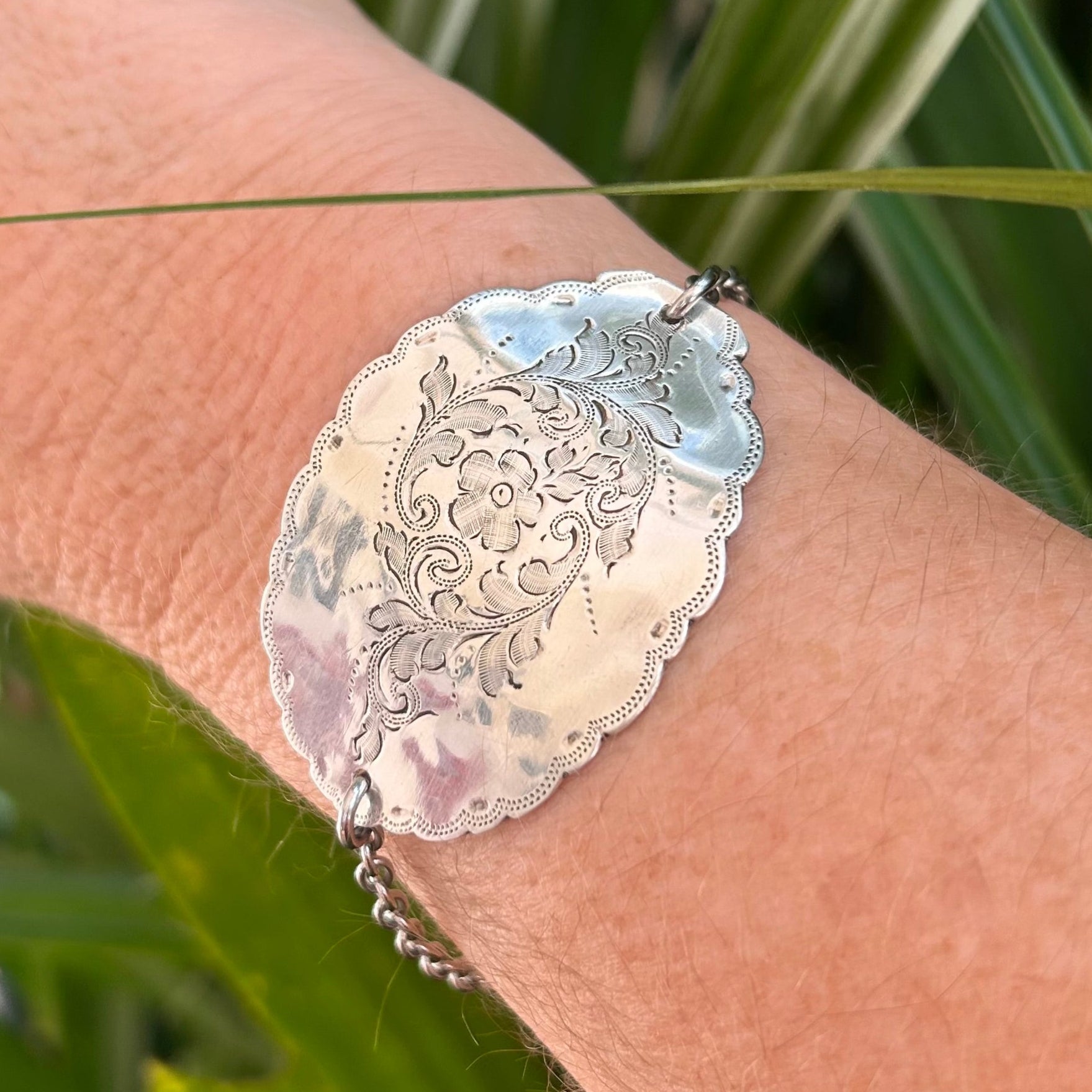 The bowl is intricately etched with a floral, leaf, and scroll pattern, rich in detail. The bowl edges that curve over the wrist are scalloped, adding a soft, feminine silhouette that mirrors the beauty of the original silverwork.