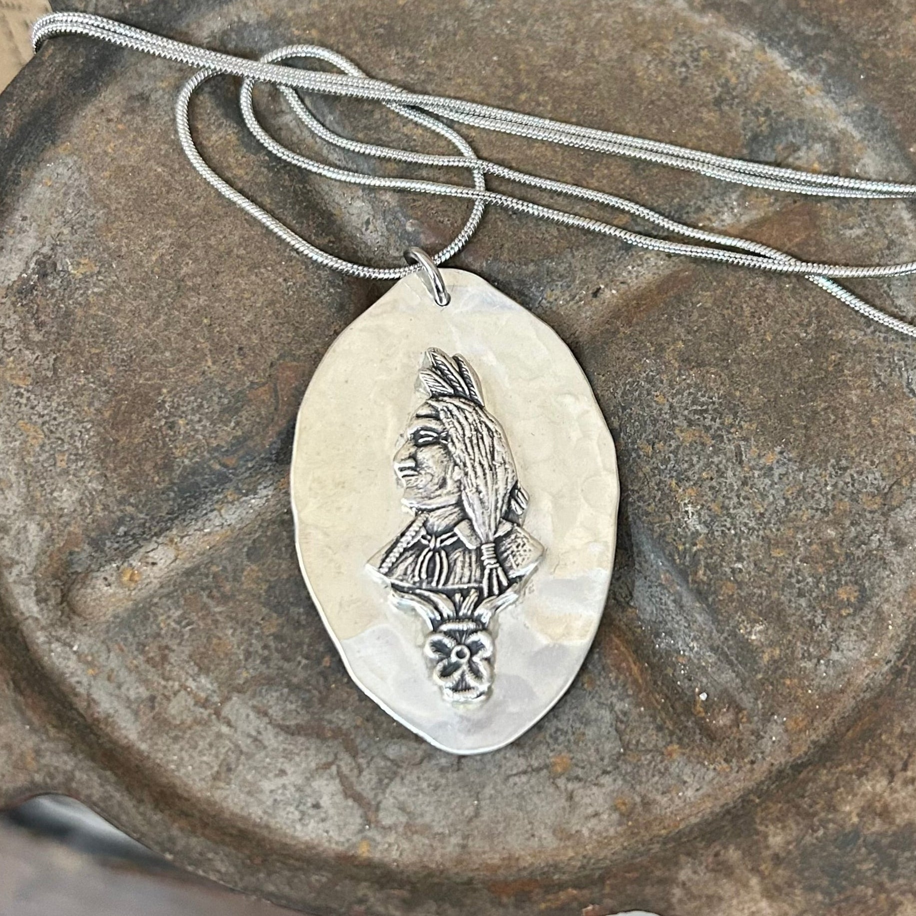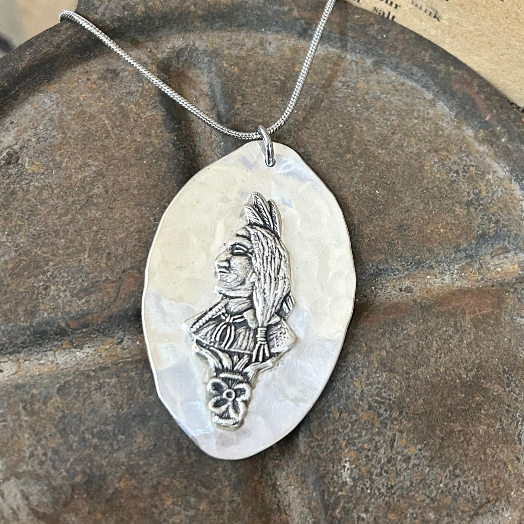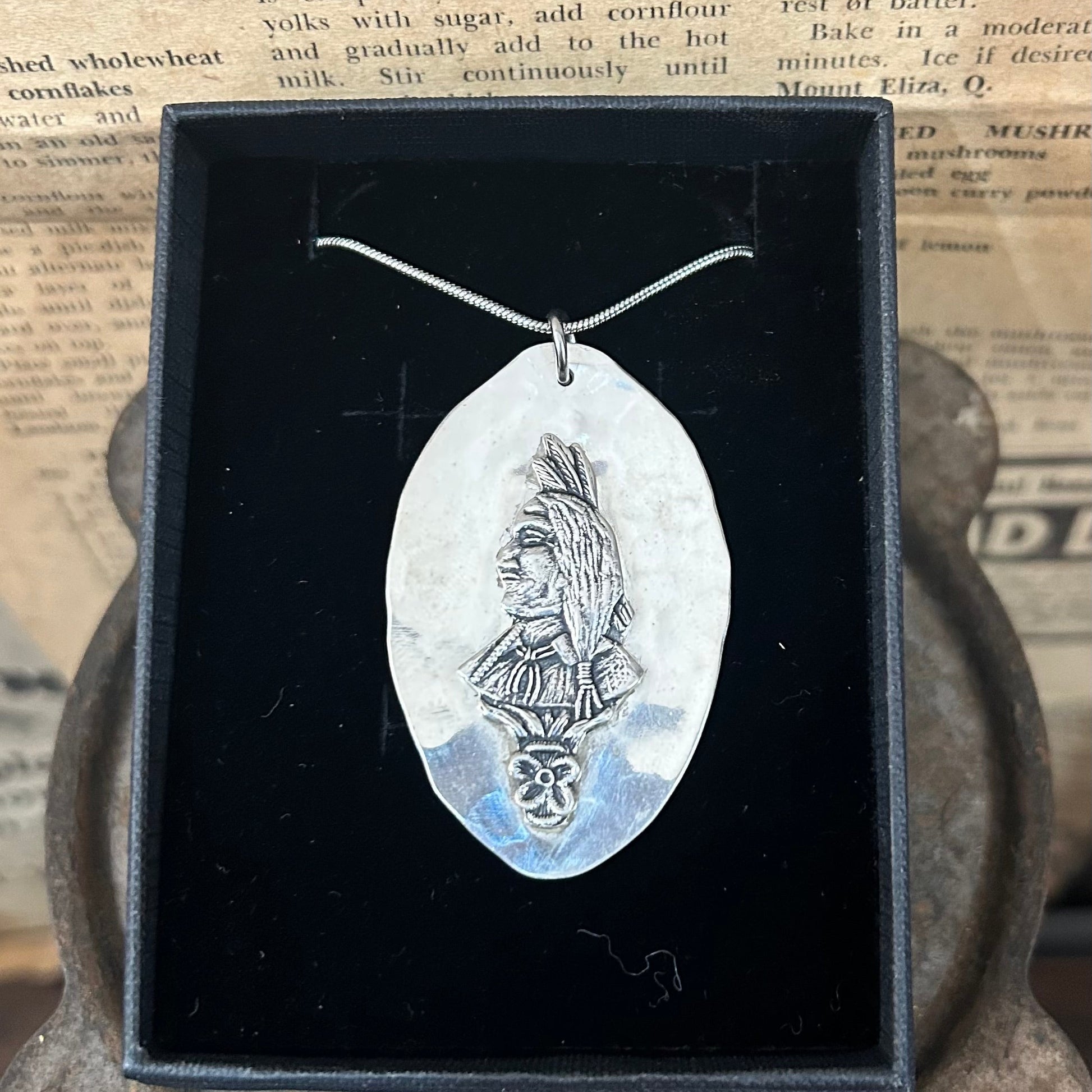 A necklace with history and symbolism, this handmade necklace has been created from two beautifully repurposed parts of vintage sterling silver spoons. The central feature is a detailed Indian head, taken from the handle of an antique spoon a proud side profile in a full feathered headdress, symbolising strength, spirit, and ancestral pride.