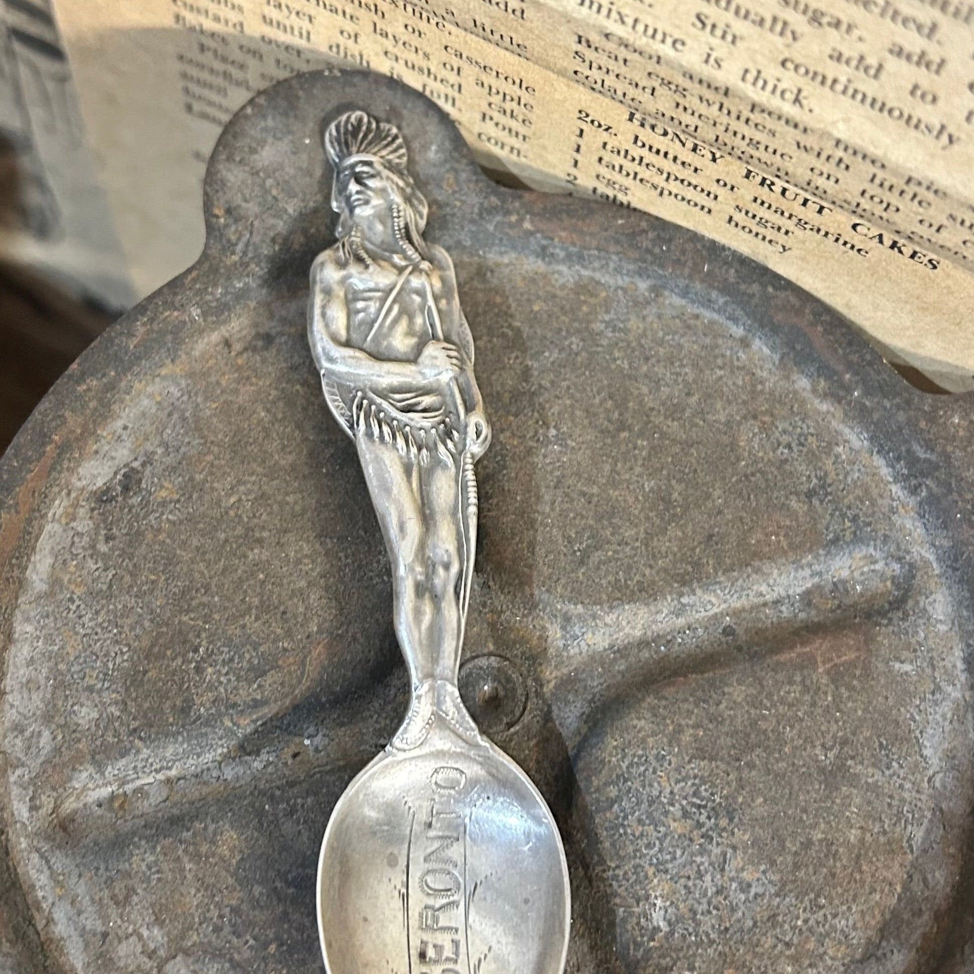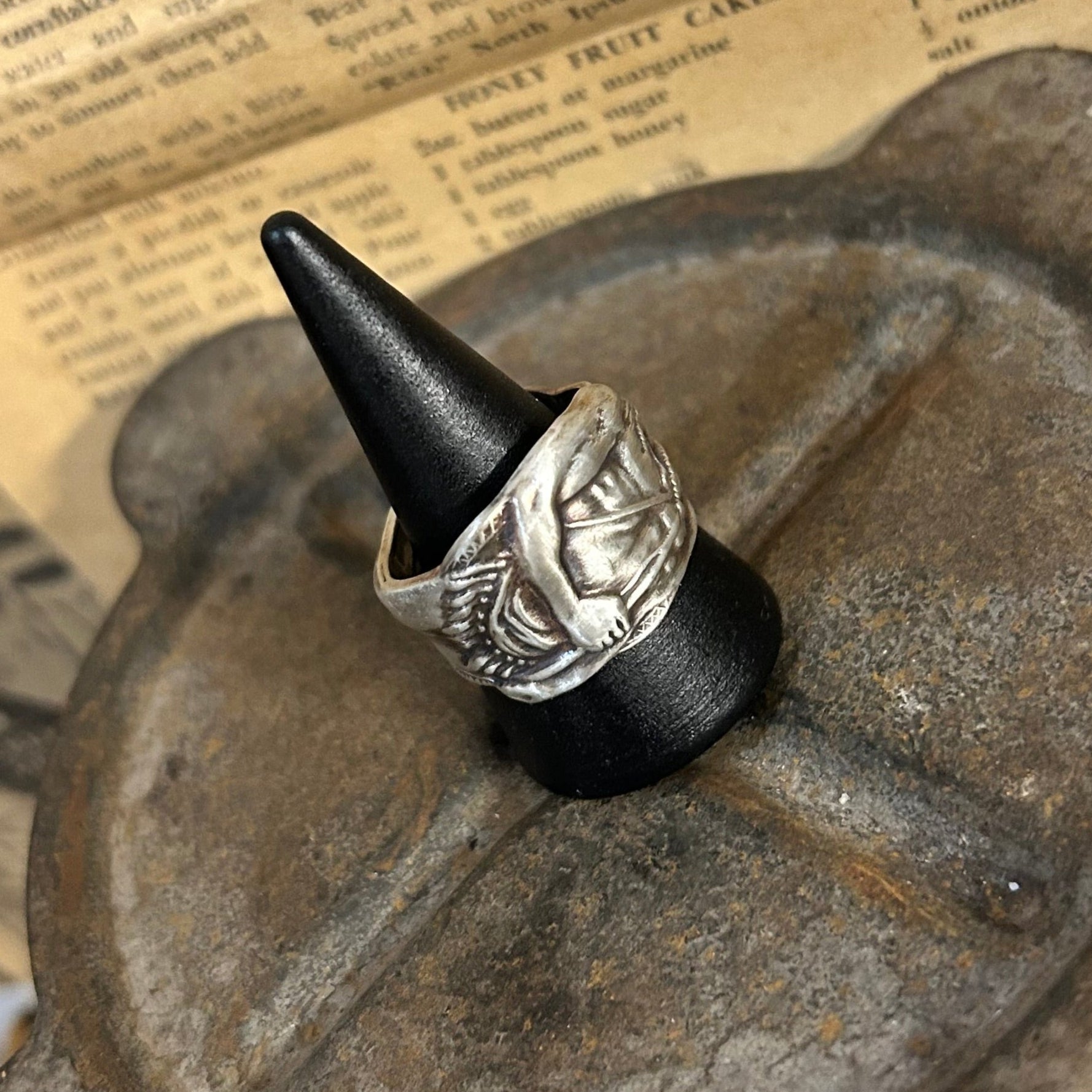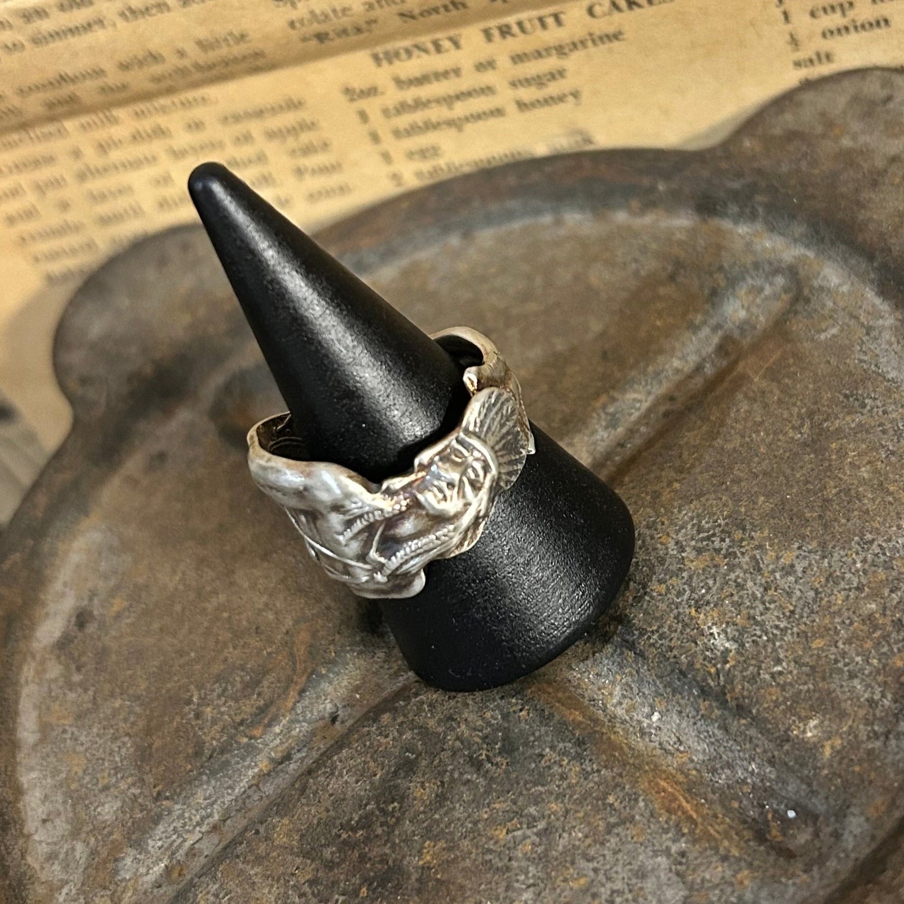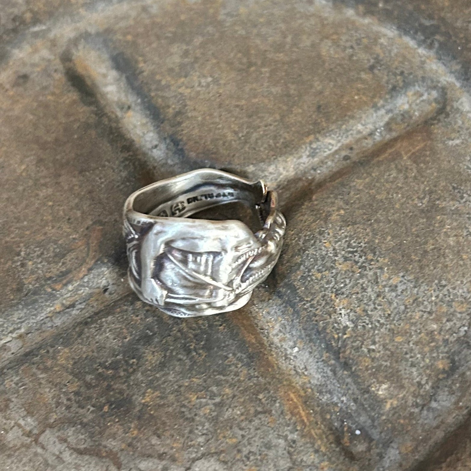 Created from a striking early 1900s sterling silver spoon, this bold statement ring features a detailed Native American chief, from the tip of his feathered headdress to the soles of his feet. The figure is rich with texture, symbolism, and presence, brought to life through exceptional silverwork rarely seen in today’s jewellery.