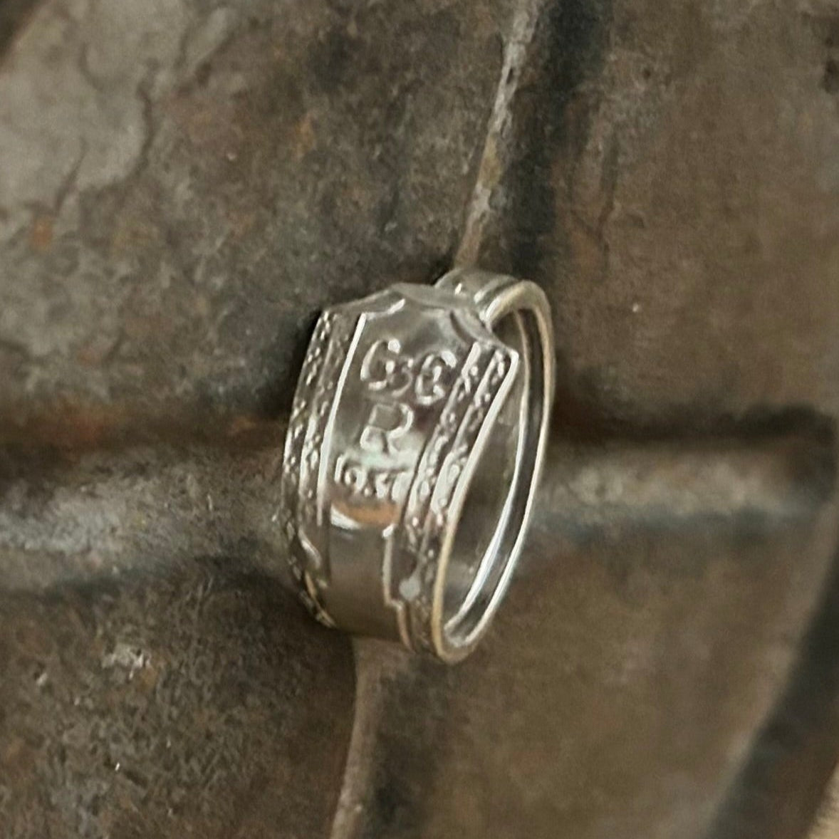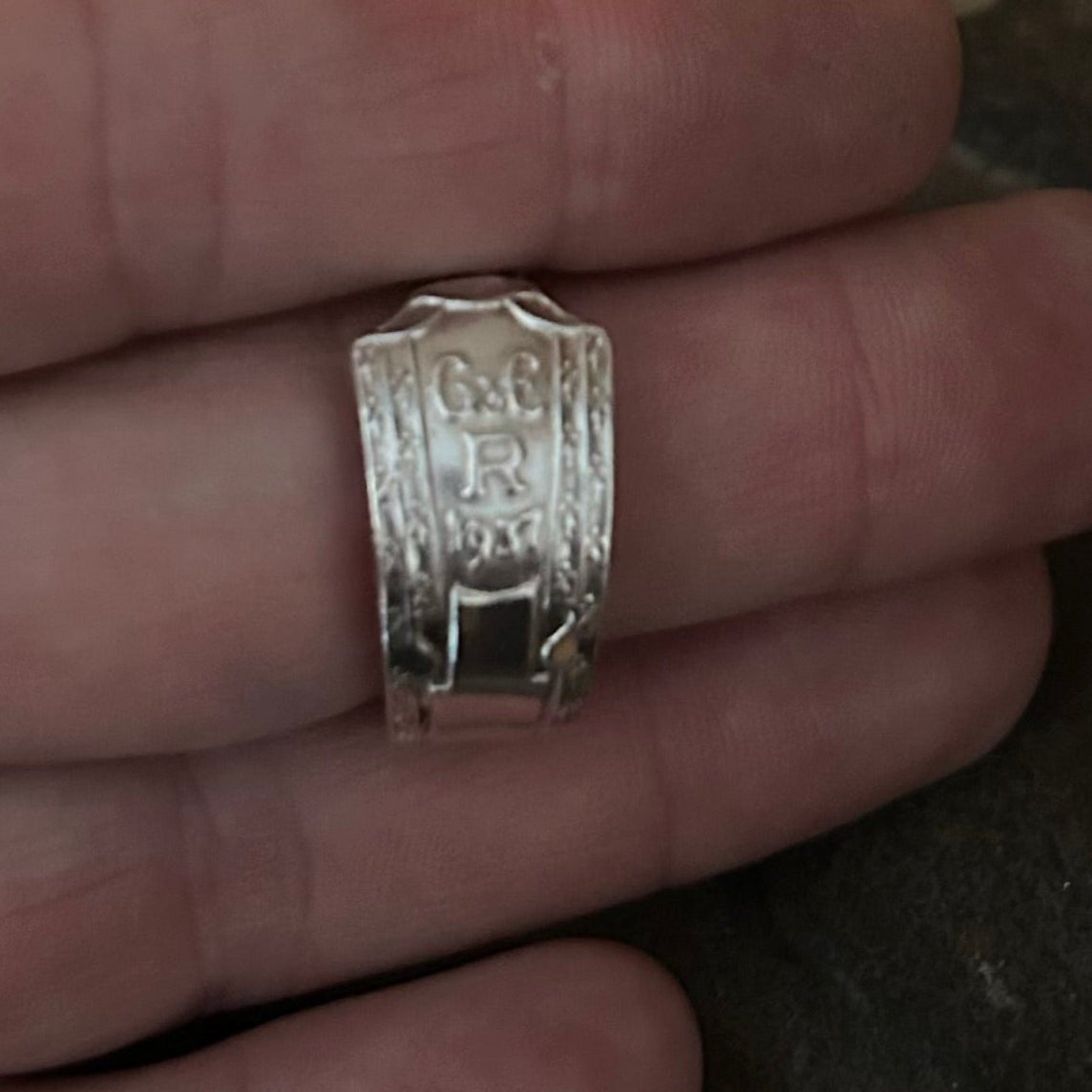 The handle has been carefully formed into a classic band ring, one end elegantly tucked beneath the other, creating a snug, smooth fit. It’s simple in shape, but full of sentiment a wearable echo of the past, brought gently into the now.