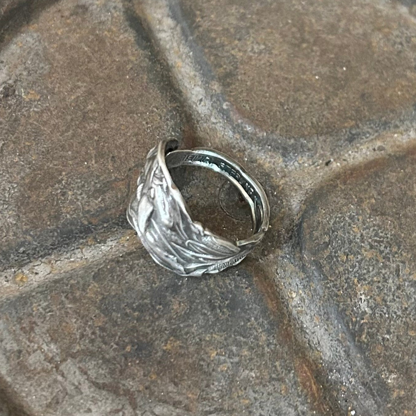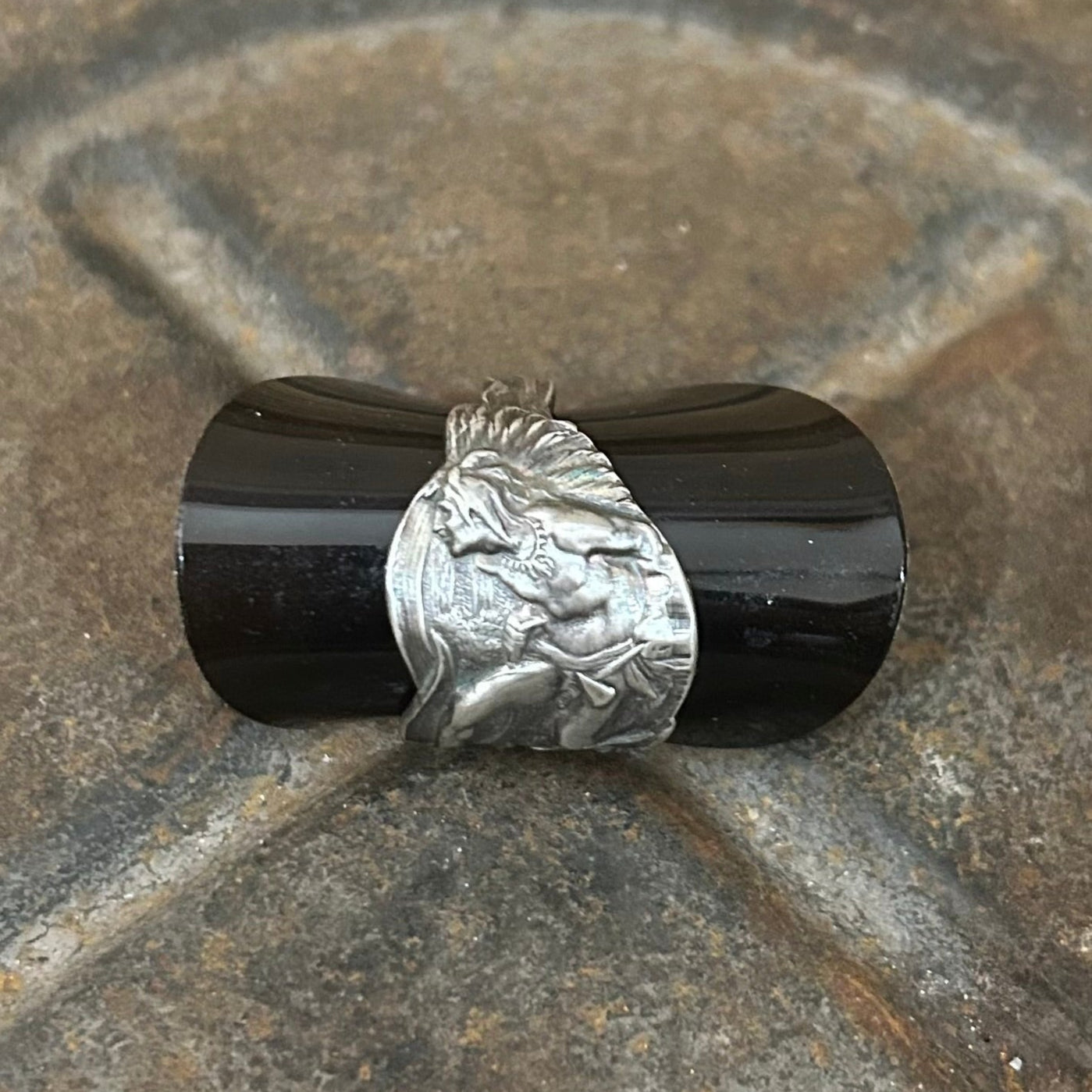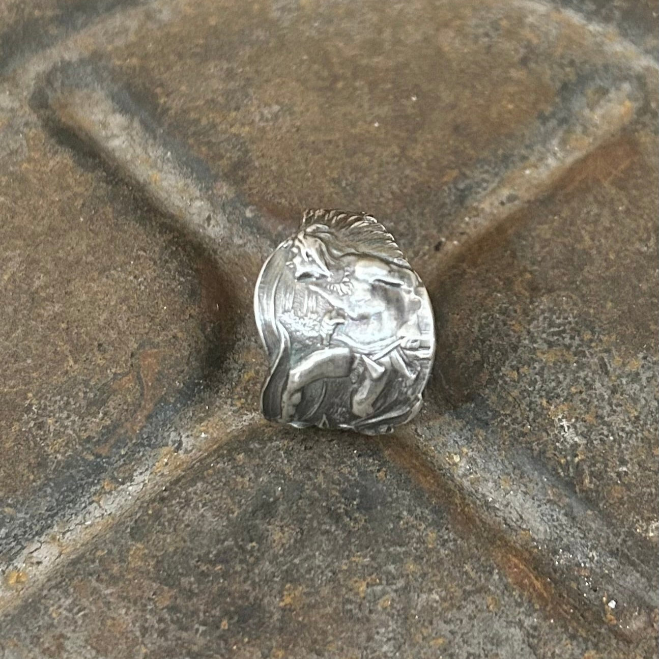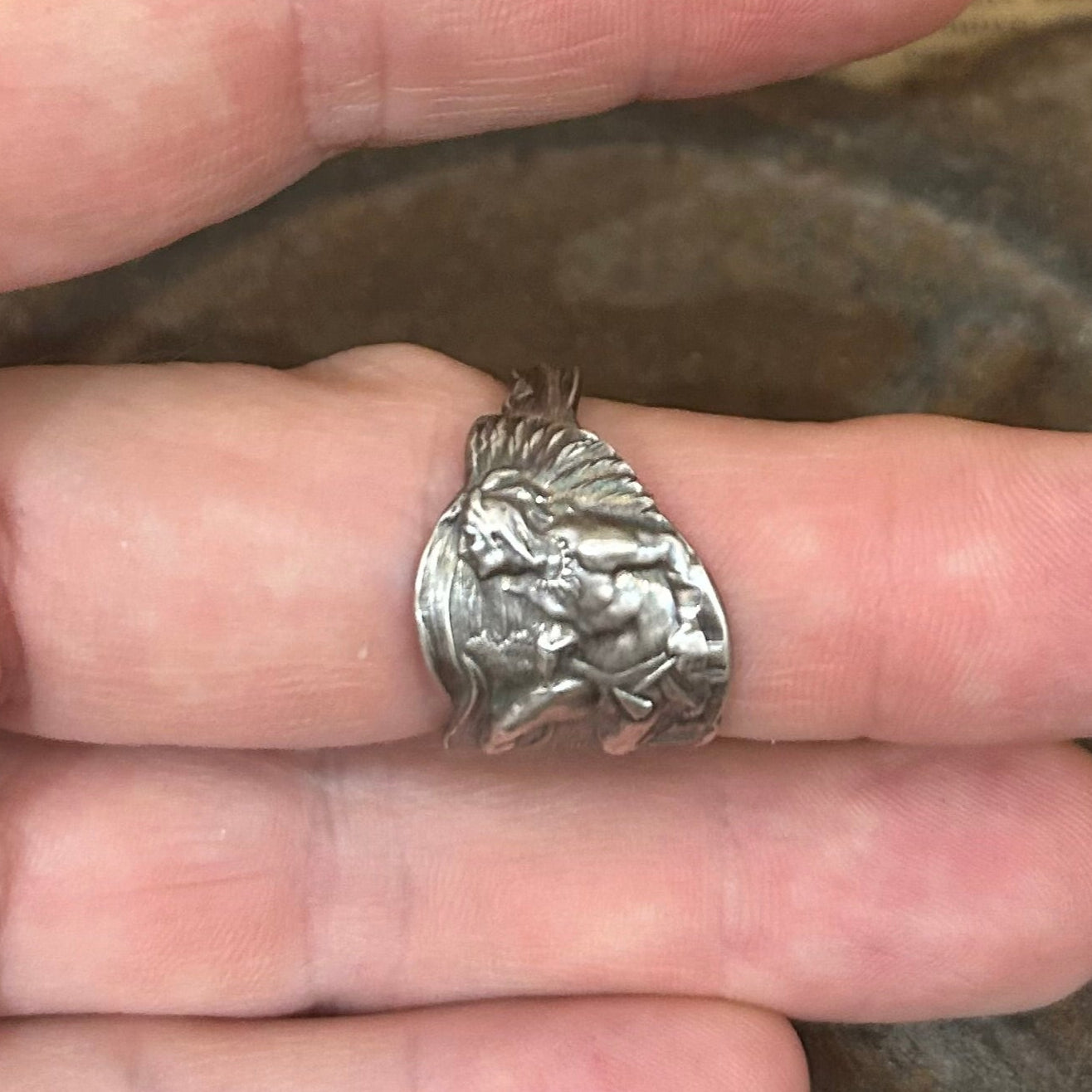 Strong, grounded, and full of presence this powerful ring carries the story of a hunter in motion, carved in stunning detail into an antique American sterling silver spoon handle. The figure, poised mid movement, captures the energy and intensity of the hunt a tribute to instinct, tradition, and survival.