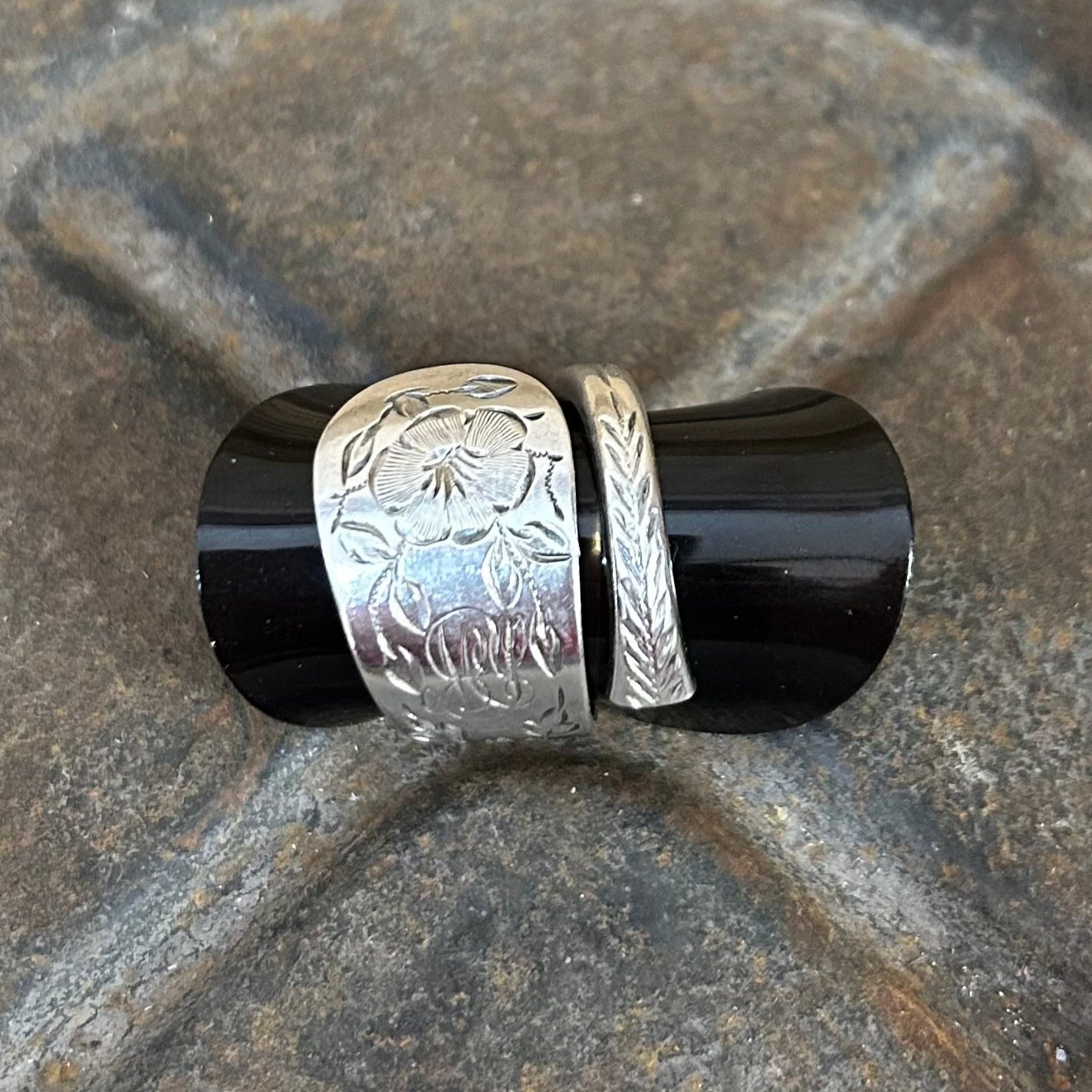 The ring has been shaped into a wrap style, giving it a gentle curve that hugs the finger comfortably, with both ends of the original design displayed. It’s a piece that feels both refined and grounded, perfect for lovers of history and antique soul.