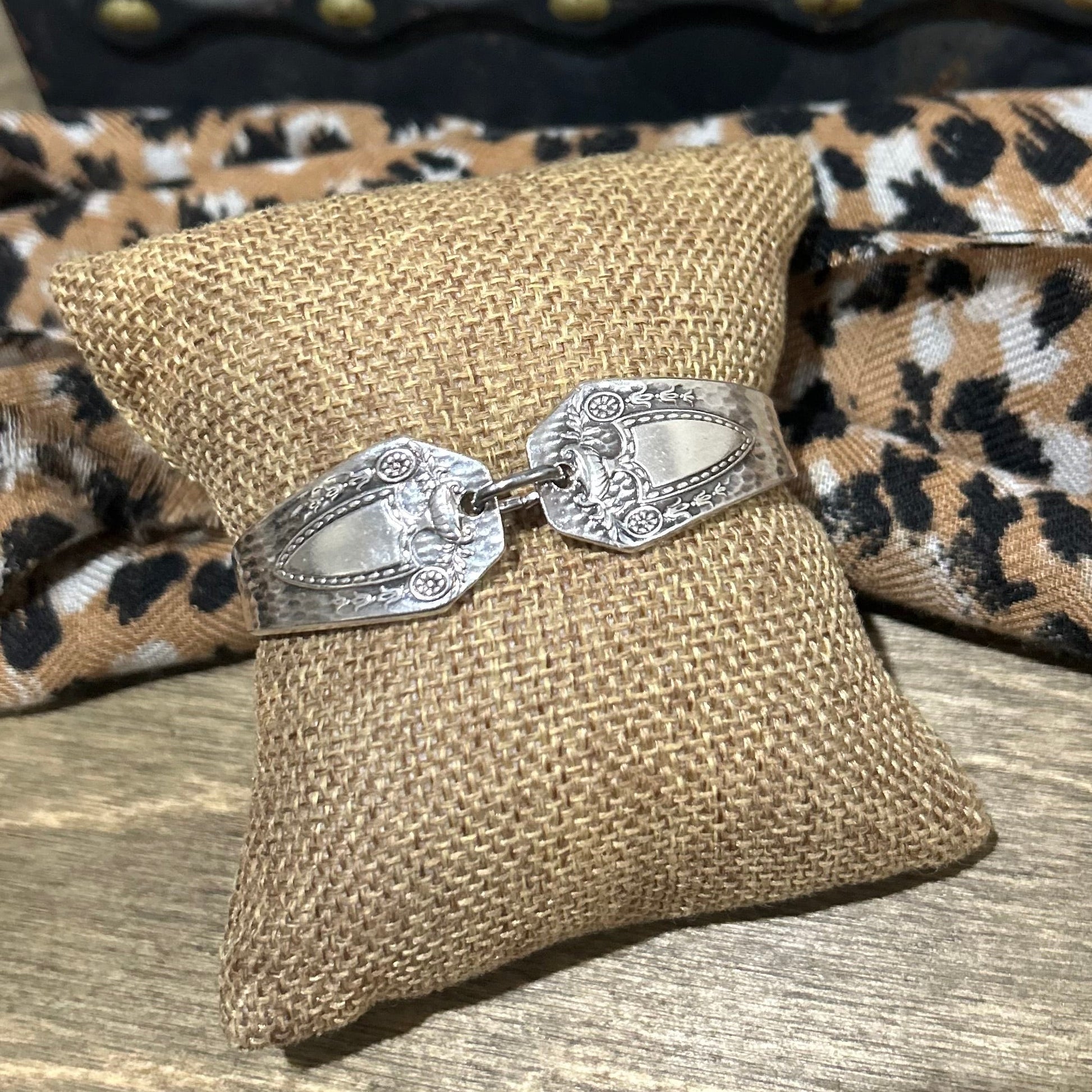 Created from genuine 1916 Rogers Bros silverware handles in the elegant Heraldic pattern, this bracelet is a celebration of heritage and craftsmanship. The design features textured detailing along the entire length of each handle a subtle, intricate, and unmistakably classic bracelet.